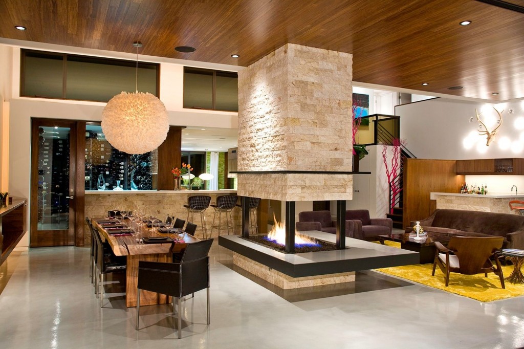 В кухне люди проводят много времени. Так уж повелось, что в России кухня — место для посиделок с семьей. Особенно уместно камин будет выглядеть в большой кухне, объединенной с гостиной в одно помещение. В этом случае камин в перегородке, перекрывающий часть пространства, позволит разбить помещение на две зоны — для приготовления пищи и столовую.