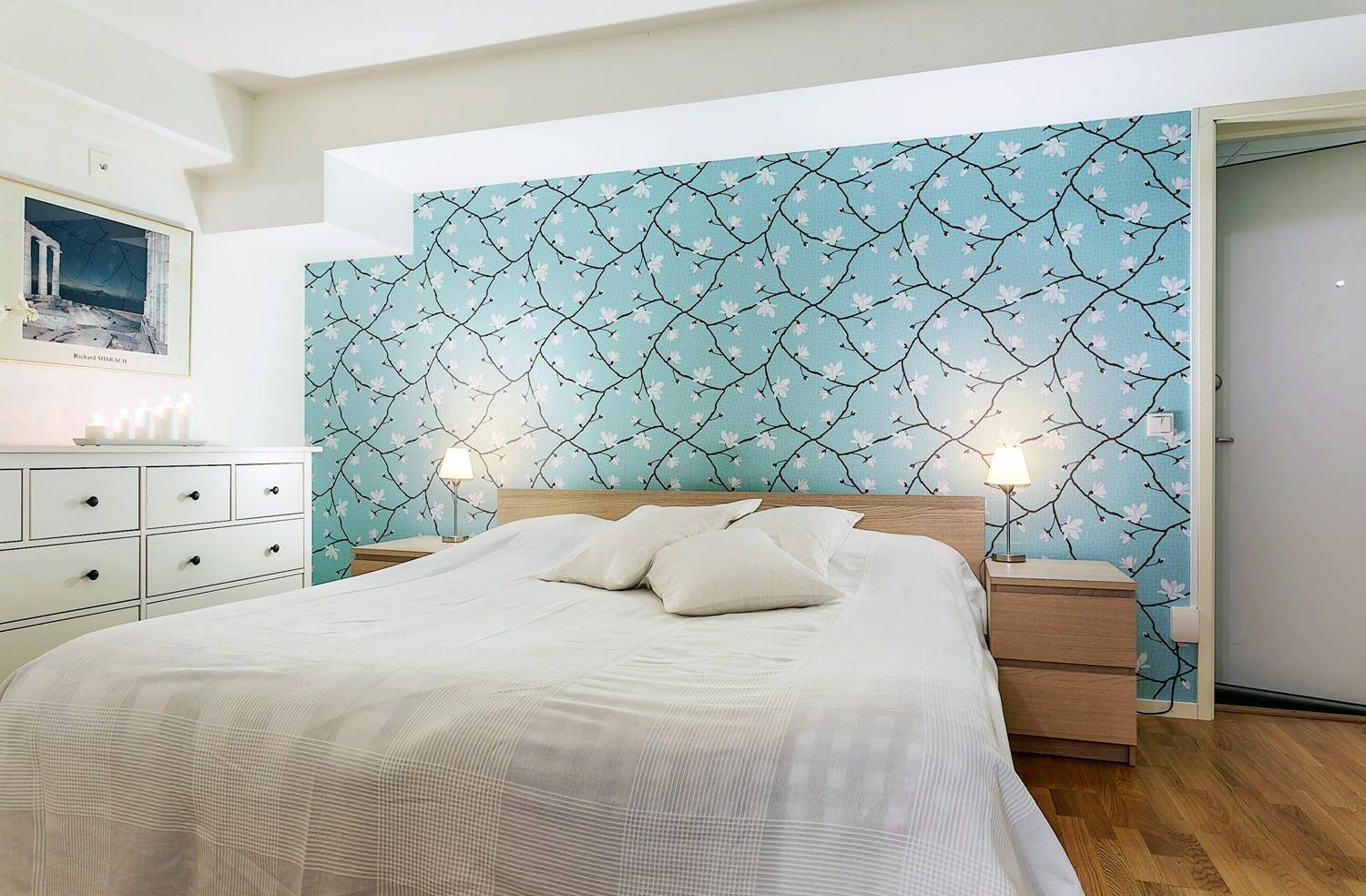 Однако если использовать сочетание бирюзовых обоев в разных цветах, кардинально меняется настроение всего интерьера.