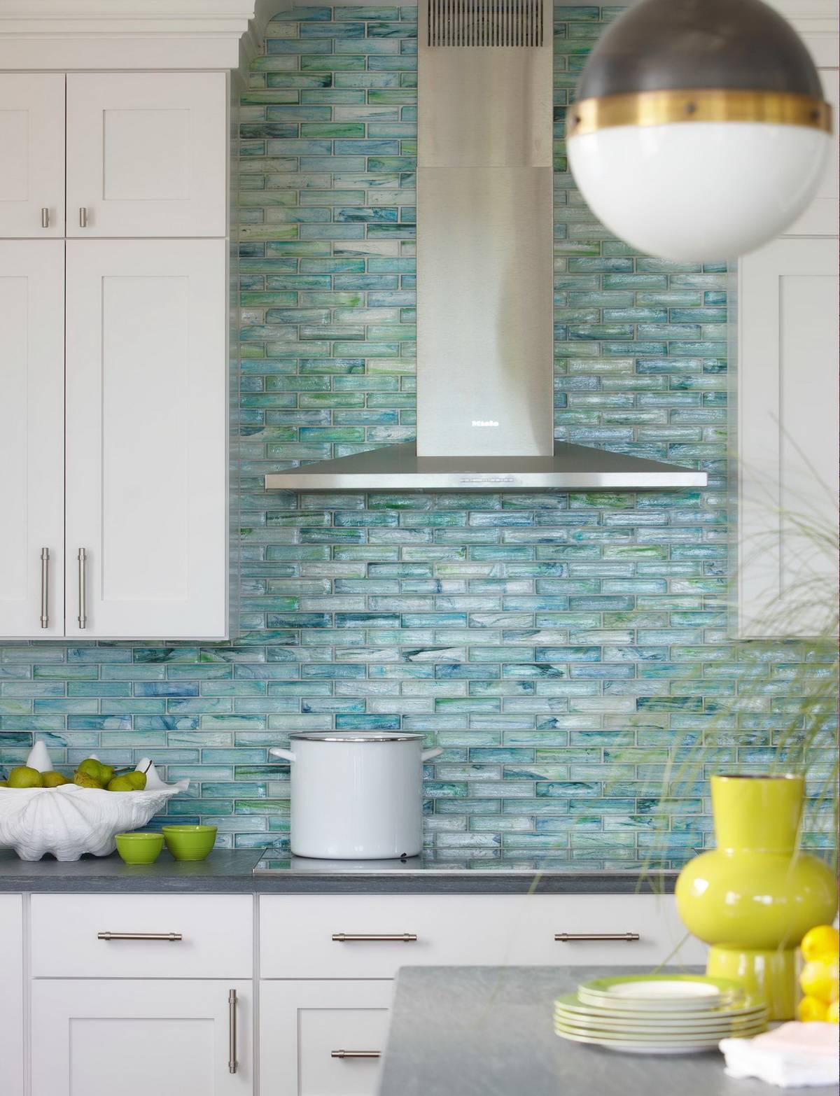 Если фасады окрашены густым бирюзовым, то фартук должен быть белым однотонным либо в виде мозаики. Пестрое оформление фартука будет гармонировать с неяркими и светлыми оттенками бирюзы. В мозаику стоит включить песочные и золотистые вкрапления. Воздушным и нежным получается фартук в трехмерной технике с прибрежными мотивами.