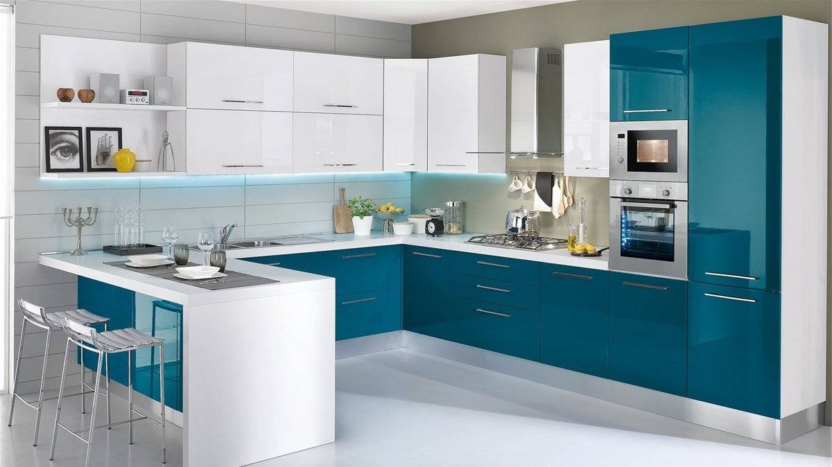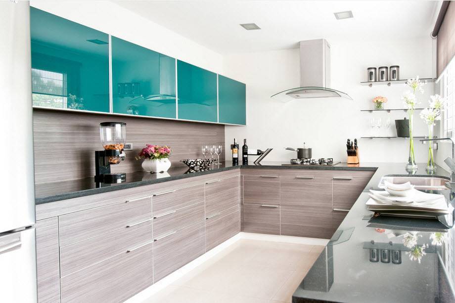 - Хай-тек. Дополнят яркие бирюзовые фасады жемчужно-серые оттенки обоев, а черные, хромированные элементы бытовой техники, фурнитуры идеально впишутся в такую кухню.