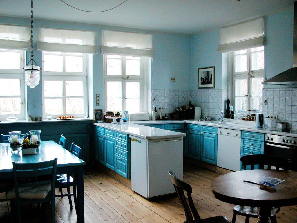 Сочетание голубого с белым — самое классическое из возможных. Оно достаточно контрастно и свежо, поэтому станет отличным вариантом для южной кухни голубого цвета. В комнате будет много света, но при этом сохранится желанная прохлада.