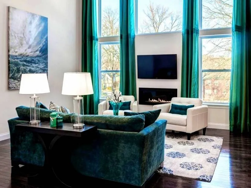 Слишком яркие, вычурные занавески совершенно не смотрятся в маленьких комнатах – они хороши только для больших помещений. Такие бирюзовые шторы хорошо выглядят в интерьере гостиной.