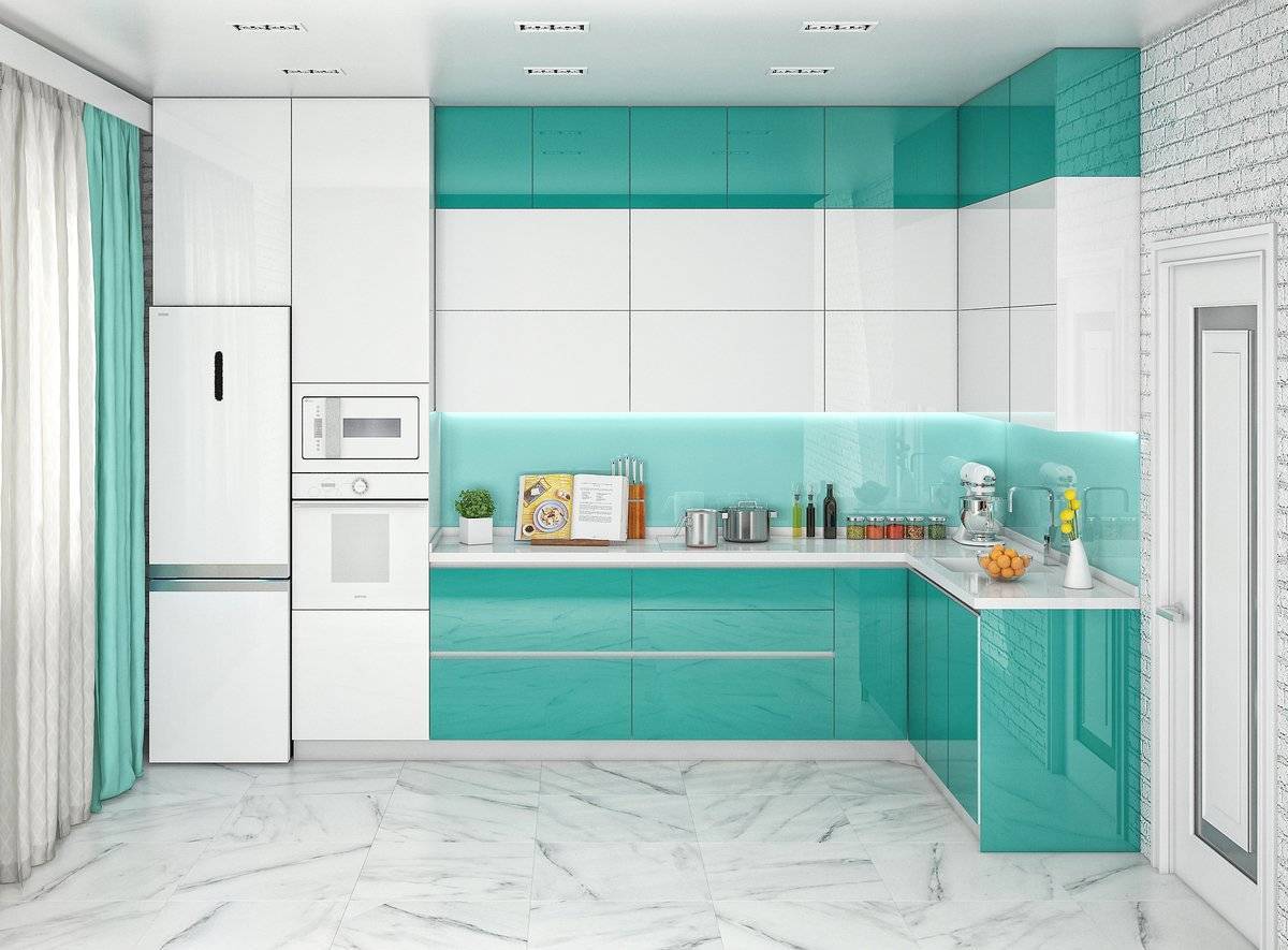 Интересный цвет бирюзового гарнитура можно выделить глубоким цветом черной столешницы в глянцевом формате. При этом стены должны быть белыми. Выбирая подводную тематику для фартука, лучше выбрать столешницу цвета прибрежного песка.