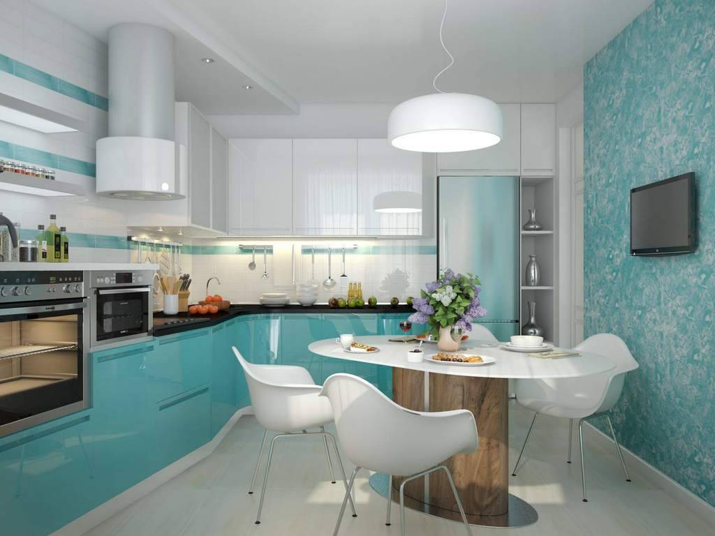 Чтобы сконцентрировать внимание на обеденном столе, гарнитур лучше выбрать светлым однотонным. Если фасады гарнитура изобилуют бирюзовым декором, обеденную зону можно оформить в белом цвете, а основной акцент сделать на кресельной обивке