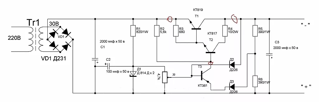 Устройство выполнено всего на трех транзисторах и отличается высокой точностью напряжения на выходе, благодаря использованию компенсационной стабилизации, а также применением недорогих элементов.