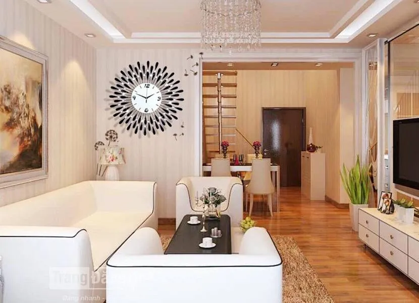 В просторной светлой гостиной с шикарной люстрой с хрустальными подвесками над белоснежным диваном можно повесить эффектные настенные часы, от белого циферблата которых исходит множество черных металлических «перышек», дополненных блестящими камушками.
