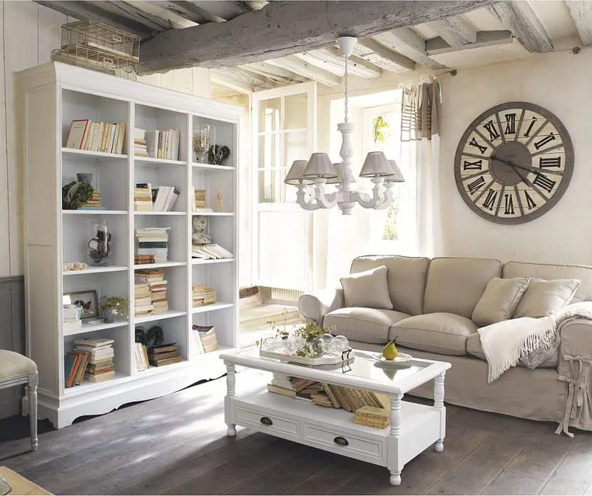 Круглый настенный механизм понравится любителям элегантной французской старины. Большие часы на стене в гостиной в стиле прованс отлично дополнят интерьер с расписной деревянной мебелью и светлыми тканями.