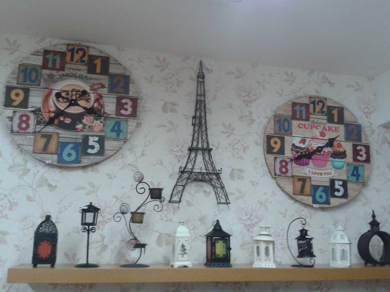 Часы настенные необычные оригинальные будут здесь как нельзя кстати, внося разнообразие и привлекая внимание гостей. Это могут быть большие, но «легкие» конструкции или же компактные модели, ярко контрастирующие цветовой палитрой