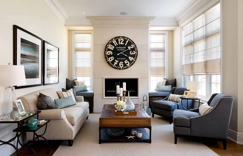 Часы обязательно должны сочетаться с другими аксессуарами и мебелью в интерьере;