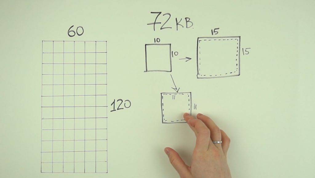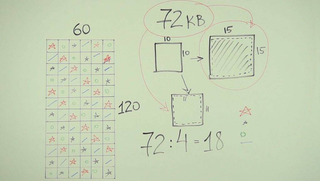 Далее определитесь, какого размера подушечки хотите сшить. Площадь изделия разделите на равные части, а их габариты выбирайте сами. Обычно выбирают подушечки размером 8–12 см. Далее нужно вычислить, сколько подушечек поместиться на вашем одеяле. Если площадь изделия 0,72 кв. м при сторонах 60 и 120 см, а подушечки размером 10х10см, поместится по длине 12, а по ширине – 6 штук. Итого – 72 одинаковых квадратов. Проще всего длину стороны в сантиметрах разделить на длину одной подушечки. 120 см делим на 10, получаем количество квадратов – 12 штук. Между квадратами расстояния нет, там только швы.