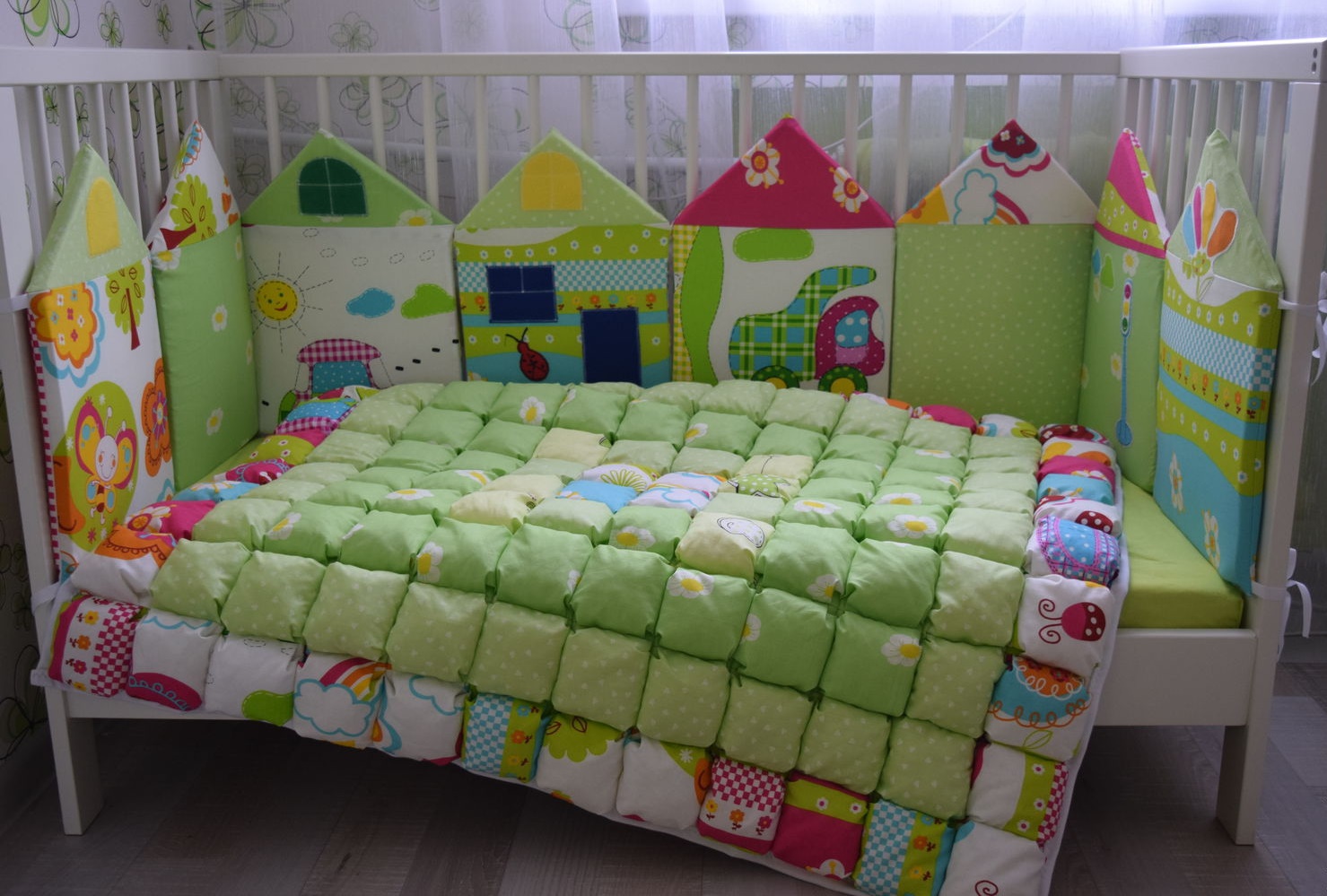 В дополнение к одеялу можно пошить и бортики на детской кроватке.