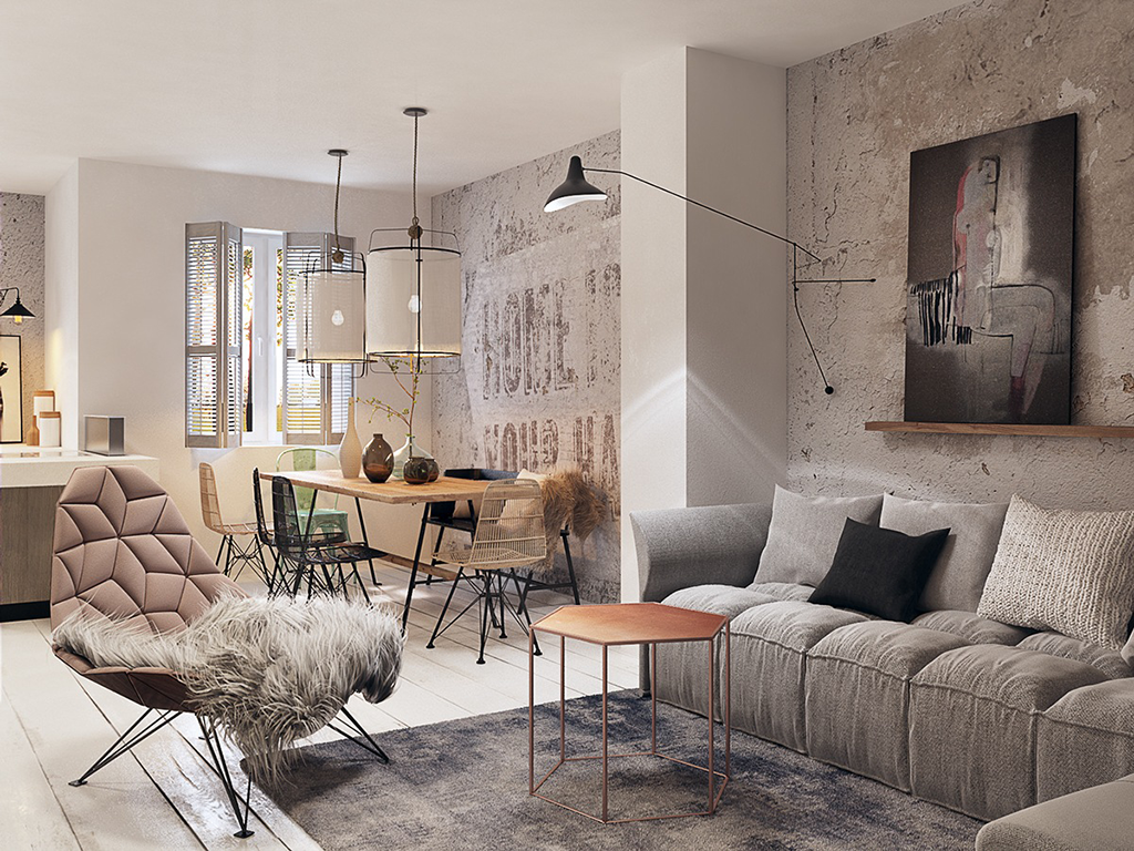 придать квартире индивидуальность с оттенком брутальности, использовать натуральные материалы