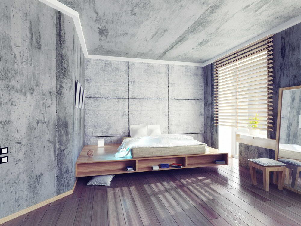 Общая простота концепции оформления даёт возможность вообще не отделывать стены или потолки привычными способами – нет необходимости клеить обои, создавать гипсокартонные конструкции и так далее. Однако, чтобы чувствовать себя комфортно в комнате с бетонными стенами, необходимо избавиться от разных сопутствующих этому материалу явлений – появлению пыли, следов она одежде от соприкосновения со стенами и тому подобных вещей. Для этого, стены стоит покрыть слоем бесцветного лака или специальной пропитки.