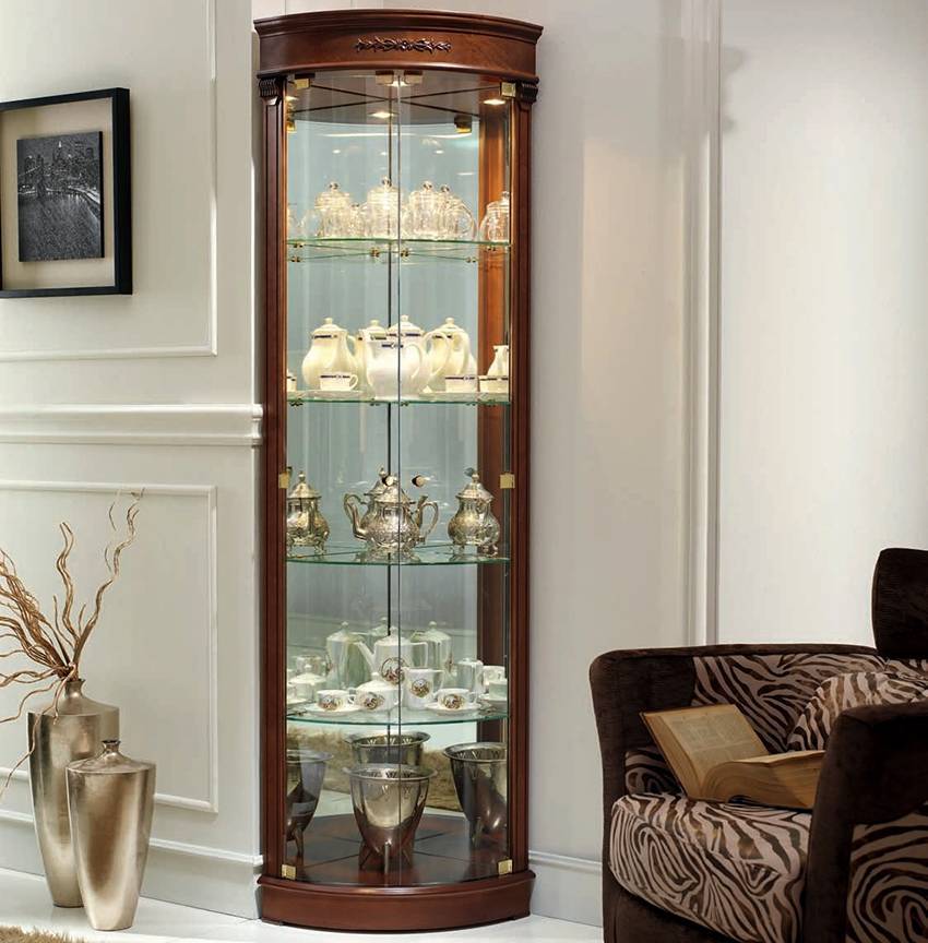 - угловой – модель особой формы, которая позволяет установить ее в угол помещения. Шкаф-витрина для посуды такого рода обязательно является самостоятельным элементом. Если сервант с обеих сторон будет загораживать другая мебель, фарфор и хрусталь продемонстрировать не удастся;