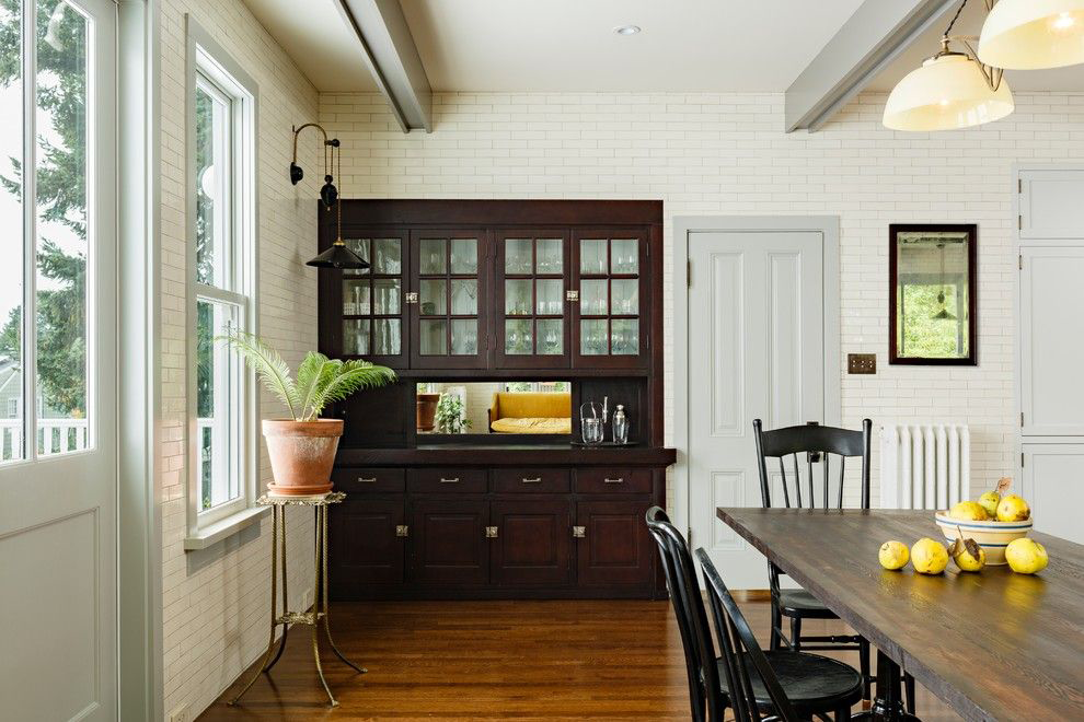 - Эклектика. Создавая современный дизайн не обязательно выбирать ламинированный лаконичный сервант, сыграйте на контрасте. Поставьте в модную минималистичную кухню винтажный шкаф под старину — это прекрасное решение для сохранения старинной мебели.