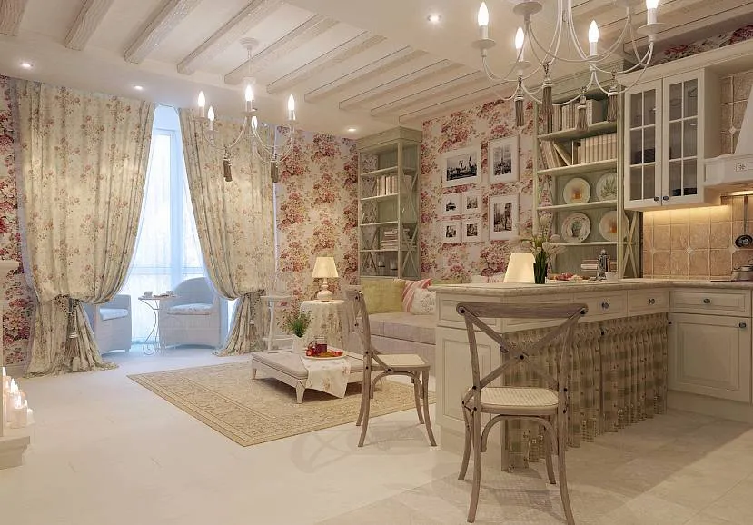 Потолок. Используется всё тот же принцип состаренной поверхности, с потёртостями и непокрашенными участками. Банальную потолочную люстру можно оформить розеткой из лепнины. Резные потолочные карнизы будут также уместны. Потолок можно оформить декоративными балками из белёного дерева. В цветовом решении — предпочтительно белый, с оттенками голубого или пыльной розы.