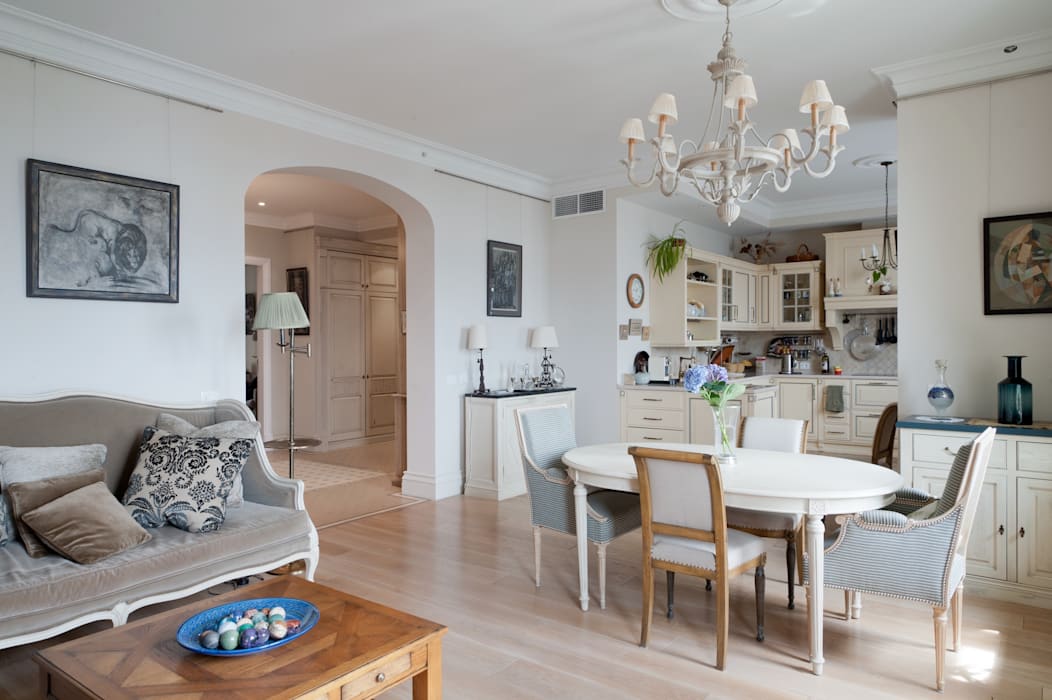 - Кухня в стиле Неоклассика — мебель похожа, строже, без лишних аксессуаров, современная техника без имитации винтажных предметов, более практичная и проще поддерживать порядок.