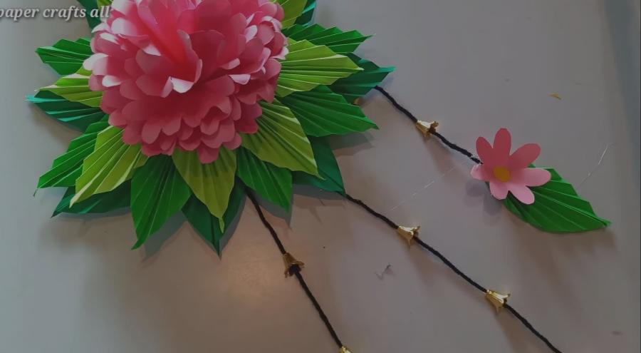 Мы вырезаем из картона основу для цветка и начинаем крепить на него несколько уровней листьев. Техника сборки цветка легкая и не требует дополнительных вырезаний фигур. Мы снова используем ниточки, на которые надо закрепить цветочки из бумаги на стену поменьше.