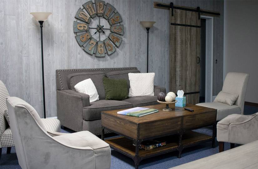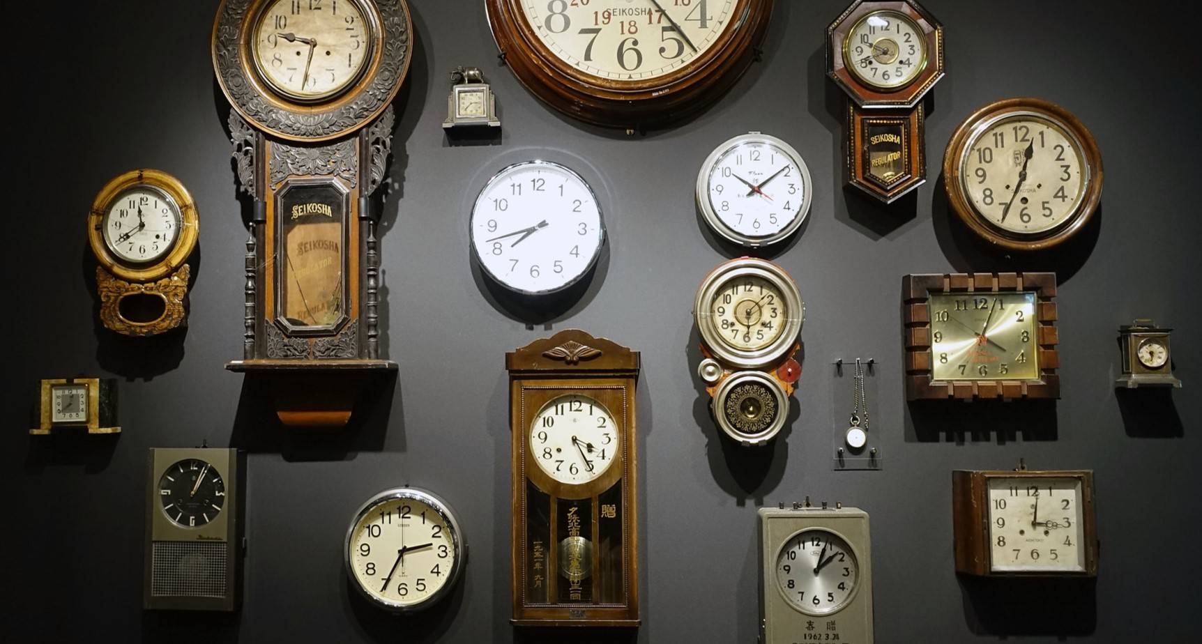 Много круглых часов в деревянном корпусе в интерьере гостиной