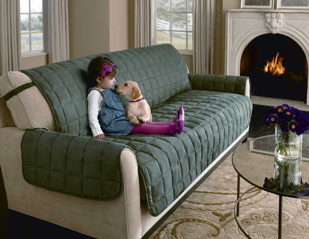 - защитная. Текстиль предотвратит преждевременное истирание обивки дивана, защитит её от появления пятен и других загрязнений. Для этого следует купить изделие из прочной ткани;