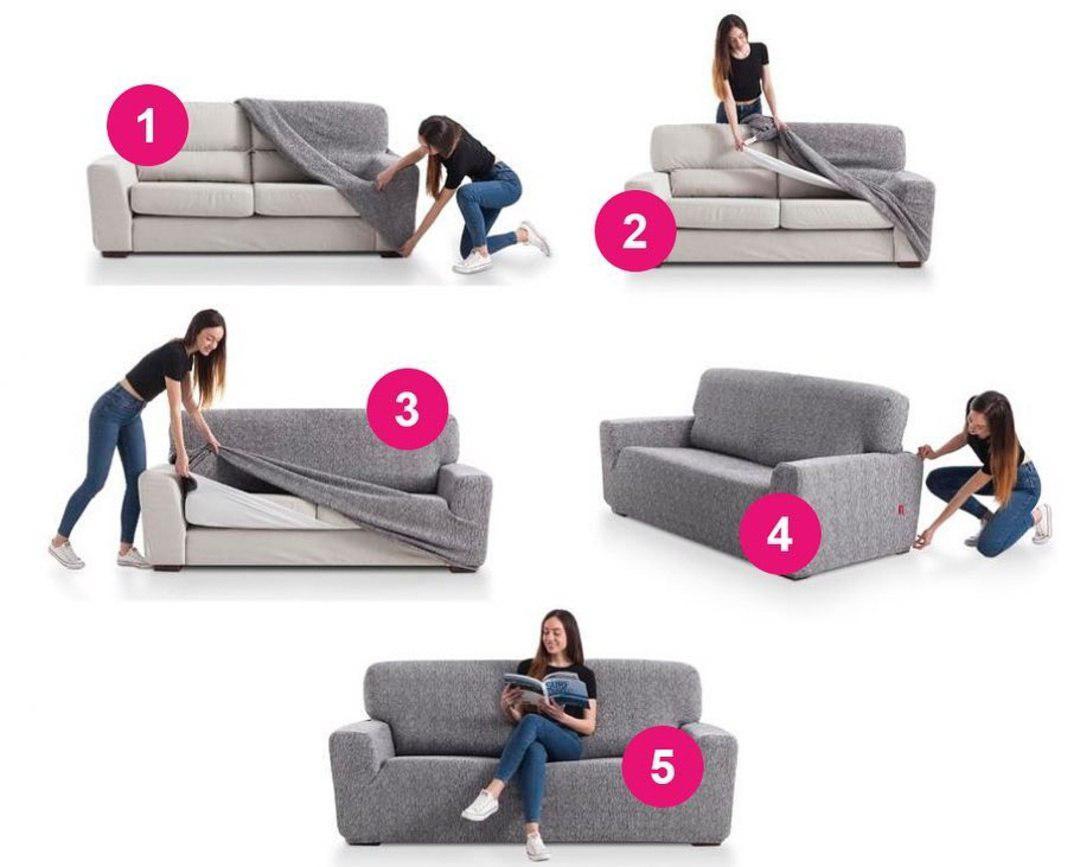 - закрепить изделие стрейч-фиксаторами, скрепить их внизу дивана и за спинкой.