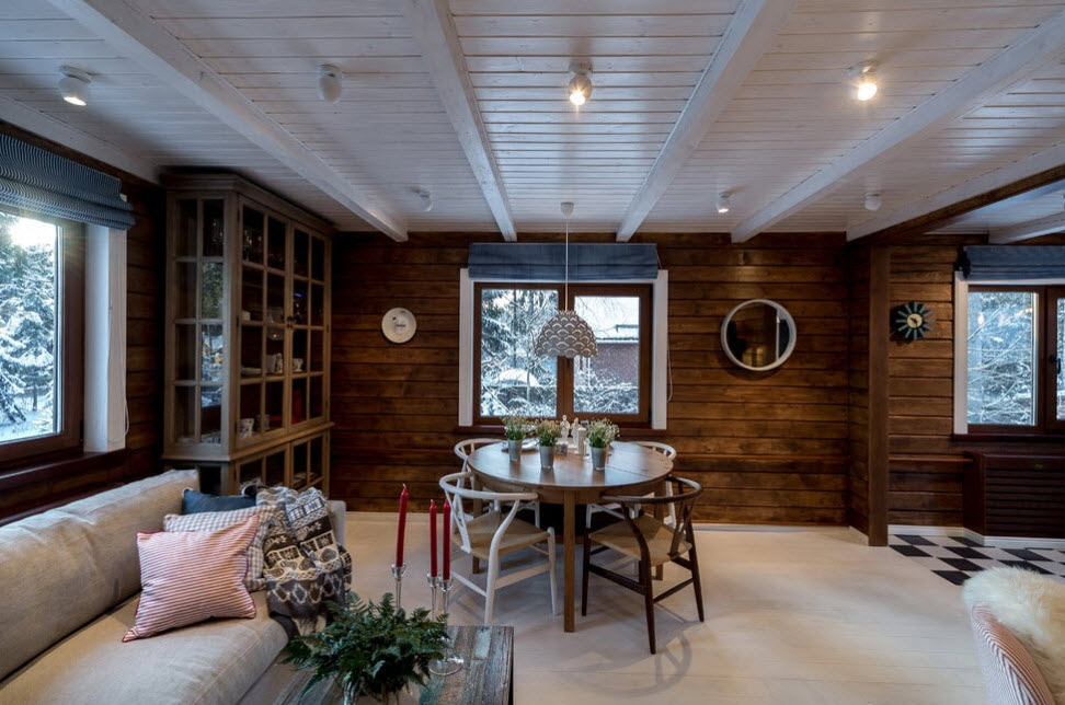 Скандинавский стиль никогда не терял своей актуальности в интерьере деревянного дома. Его популярность заключается в простоте оформления. Отличительные черты: