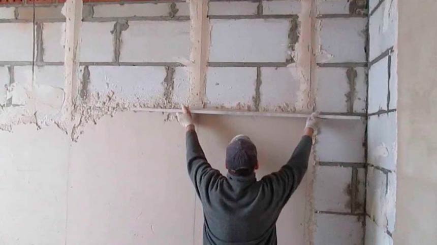 Когда раствор слегка подсохнет, нужно будет удалить маяки. Пропорции цементно-известкового раствора для штукатурки оставшихся от них следов идентичны рабочему составу. После этого отделывают проблемные и труднодоступные места: у пола и потолка, в углах.