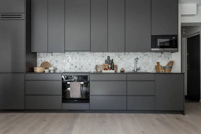 В матовых кухнях «Воксторп» есть серые фасады, накладные панели и стеклянные дверцы. Особенность серии – отсутствие рельефных филенок и фурнитуры на поверхностях. Модели подходят для оформления современных интерьеров. В качестве ярких оттенков используют столешницы.