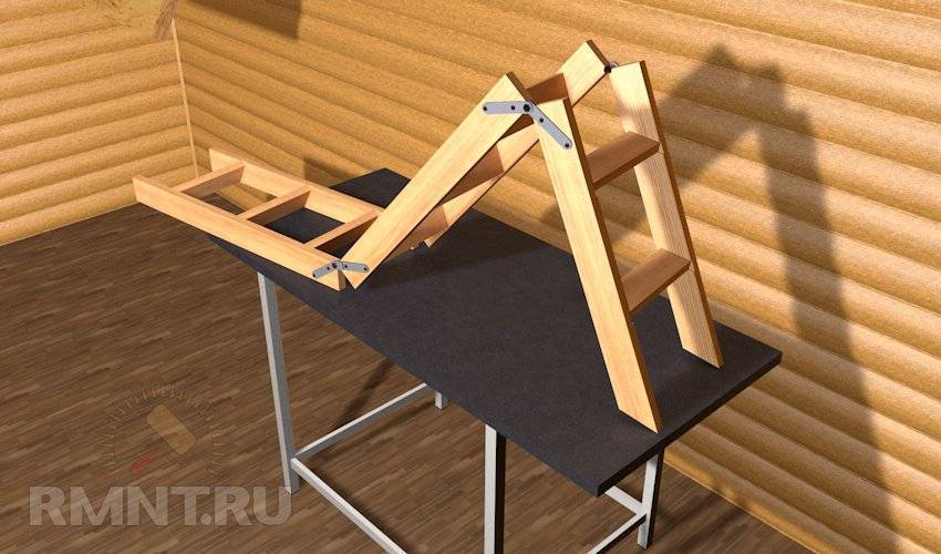Берем приготовленную заранее деревянную лестницу нужного размера. Внизу и вверху нее закрепляем по ширине пару брусков: нижний жестко, а верхний на петли. Отмерив две трети от всей ее длины, разрезаем ножовкой лестницу. Получаем две части конструкции: нижняя будет более короткой, а верхняя длинной.