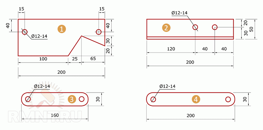 Это самый ответственный элемент конструкции. Для его изготовления понадобится: стальной уголок, пластина и полосы толщиной не менее 3 мм. Форма деталей понятна из схемы, но размеры места сверловки следует определить индивидуально, исходя из ситуации по месту. Изготовленные детали должны быть качественными, их следует зачистить и обработать кромки.
