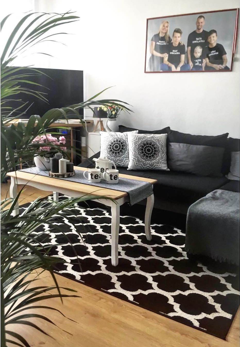 Если на черно-белой кухне просто необходим контраст столешниц и шкафов, то в гостиной эту роль выполняют графичные ковры или шкуры. Великолепный черно-белый ковер со смелым геометрическим рисунком (например, в марокканском стиле) может быстро придать комнате контрастный монохромный вид. Можно использовать простые черные и белые полосы, сложные узоры и интересные принты.