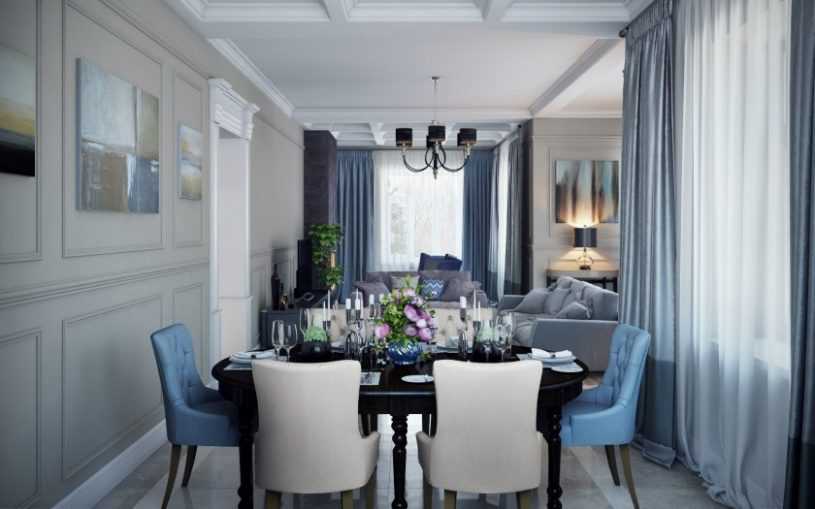 Синие детали хорошо вписываются белый дизайн контрастного зала, если в нем присутствует больше светлых поверхностей холодного спектра. Гармоничны разноцветные глянцевые поверхности, а вот в матовом исполнении голубая палитра будет более органичной с глубокой серой гаммой.