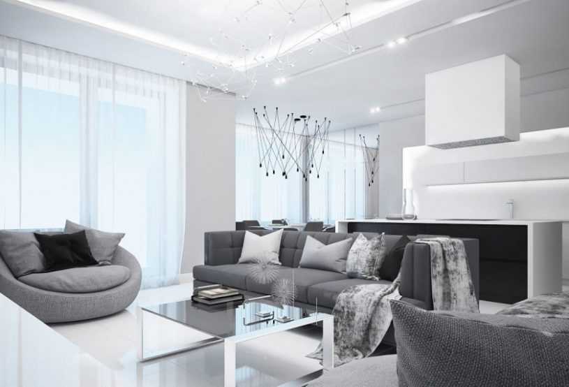 Ахроматические цвета дают гармоничное сочетание, не напрягающее глаза и хорошо подходящее как для малогабаритных, так и для более просторных комнат. Интерьер гостиной в бело-серых тонах может быть разным: для уютной камерной обстановки лучше подойдёт сливочный или молочный оттенок (т. е. не ярко-белый).