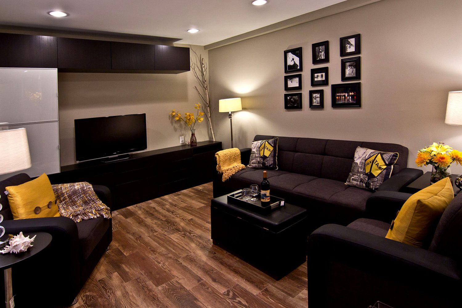 Яркий желтый ковер и несколько аксессуаров в серой гостиной + черный цвет