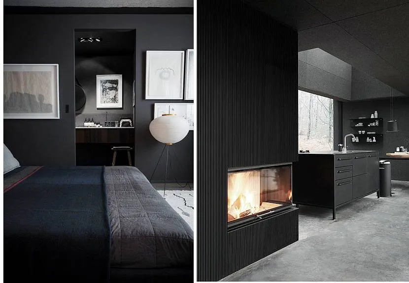 Не стоит забывать об освещении. Если есть большие панорамные окна, из которых в комнату попадает большое количество естественного света, тогда в черном цвете можно оставить целых две стены. Когда в помещении отсутствуют окна вовсе, но есть уютный камин, лучше оставить затемненной одну перегородку.