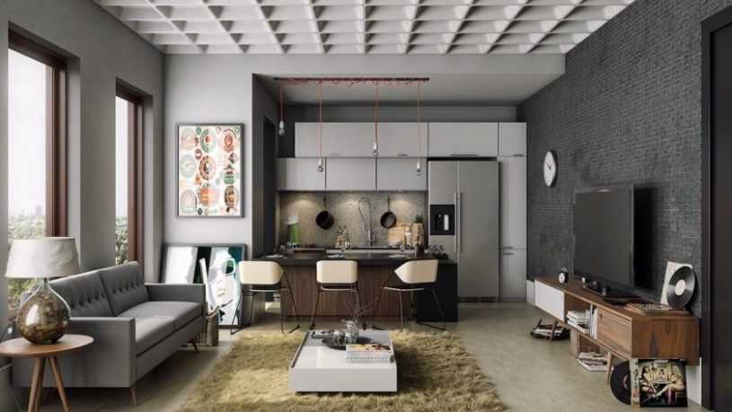 Минимализм подразумевает свободное пространство, такой интерьер лучше всего выглядит в сочетании серого и белого цветов. Часто используется описываемый цвет при создании интерьера в стиле лофт. Это может быть имитация каменной кладки и бетонных покрытий.