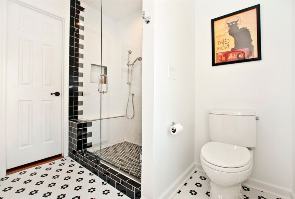 Что же касается интерьера то здесь, как и в случае с полом лучше всего применять различные техники в зависимости от исходных данных комнаты. Черные полосы с белым вставками сделают помещение несколько длиннее. Вертикальные вставки черного цвета добавят пространству высоты. Помимо этого, черный колер гармонично смотрится в качестве основного фона на стене или полу. Он делает душевую более строгой, но в то же время выразительнее.