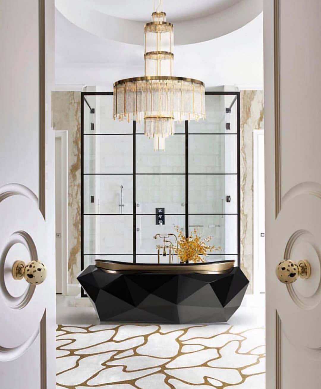 Роскошная черно-белая ванная комната с золотыми деталями.