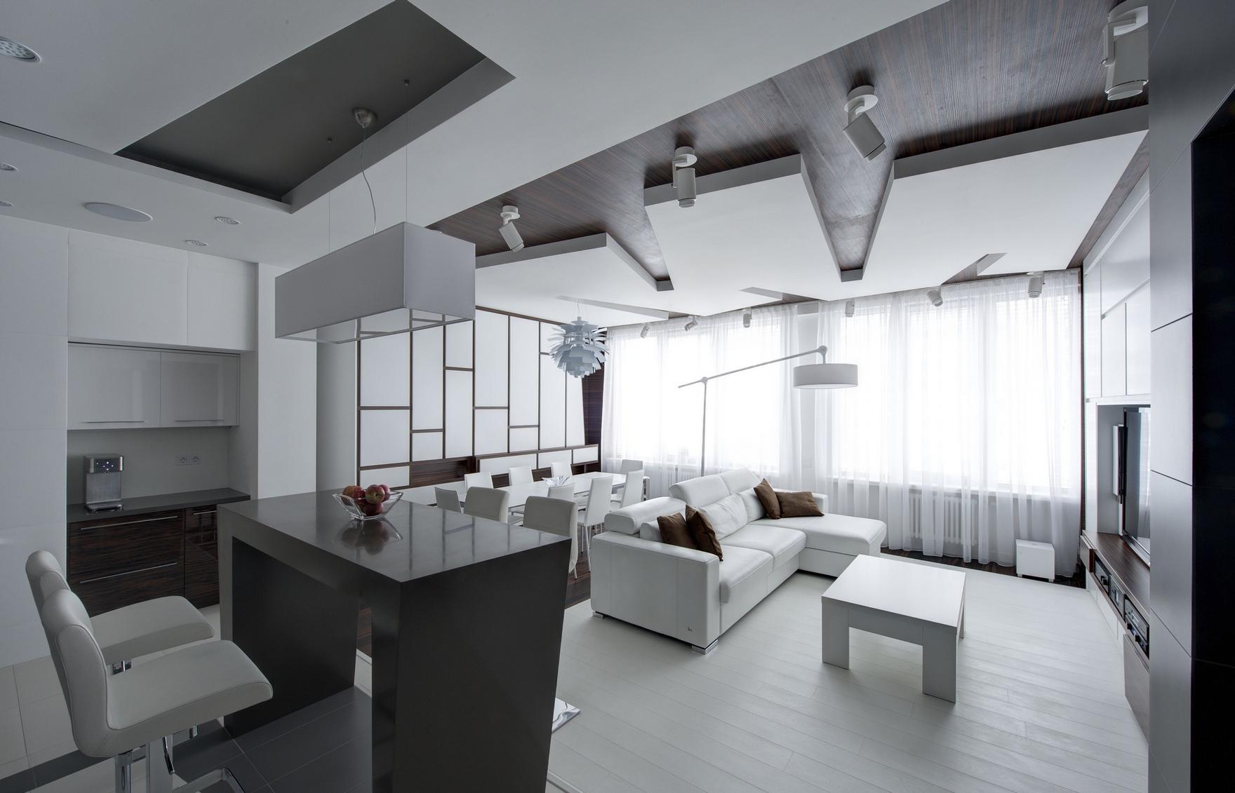 Белая и черная мебель в интерьере гостиной-кухни
