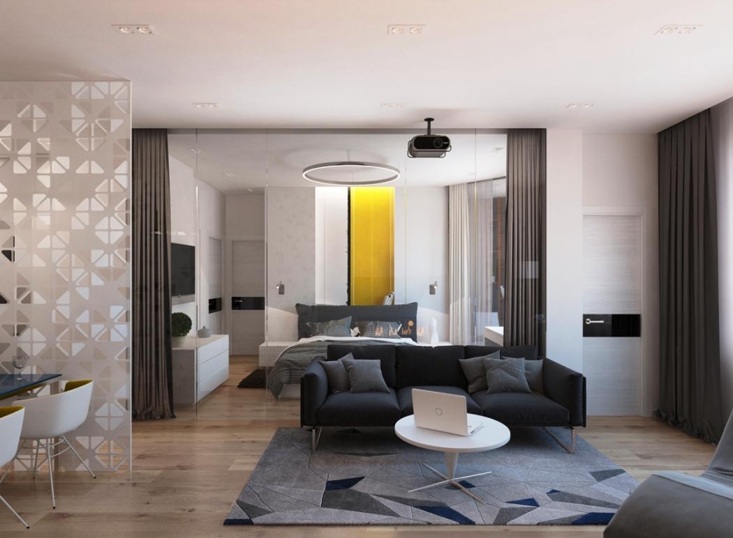 - зонировать территорию. Такой элемент разделения поможет не только аккуратно хранить вещи, но и отделить спальную зону от рабочей, к примеру, в квартире-студии, состоящей из 20-25 квадратных метров. При этом фасад шкафа может стать единым целым с цветовым наполнением и оформлением спальной или рабочей зоны;