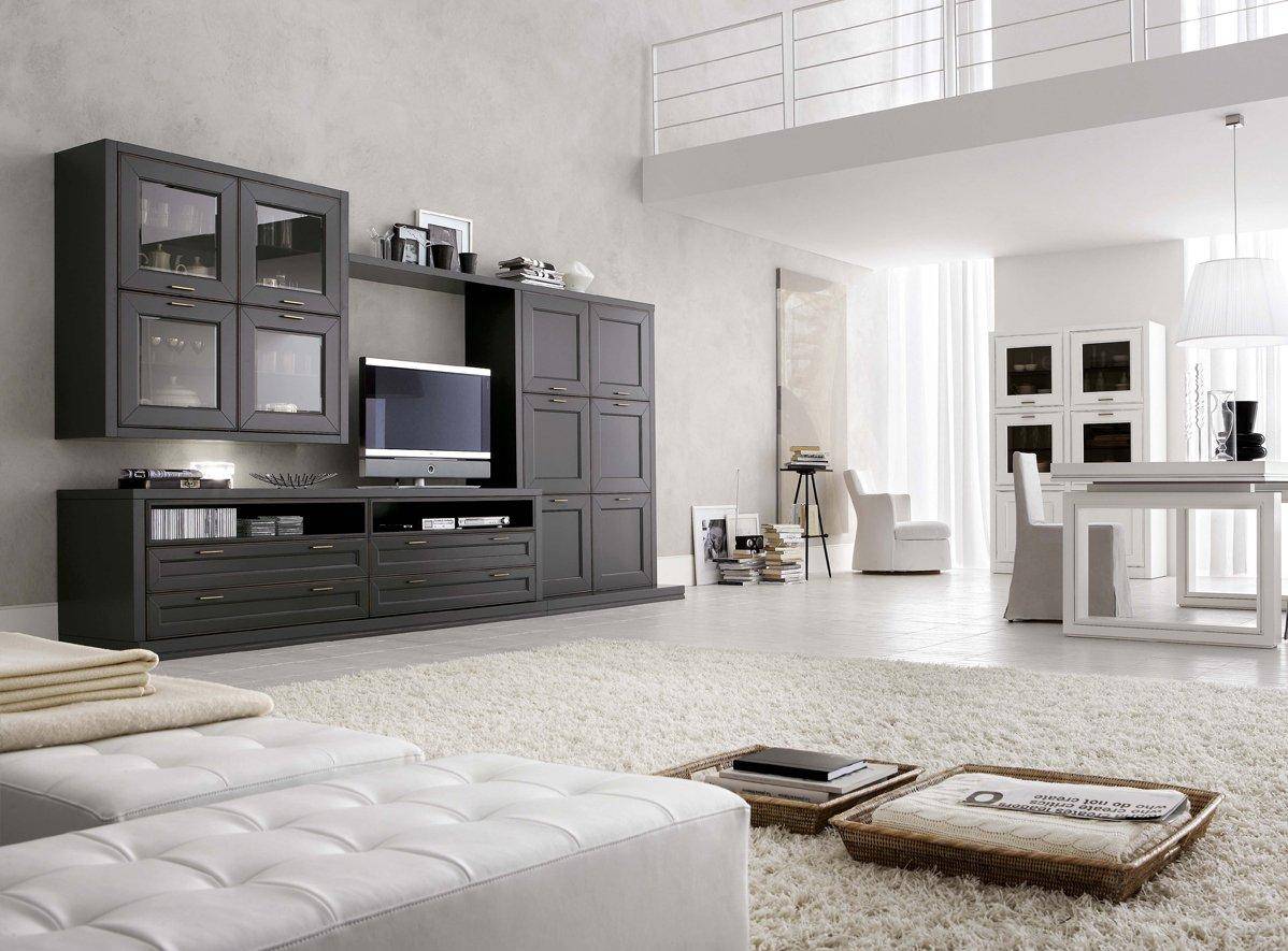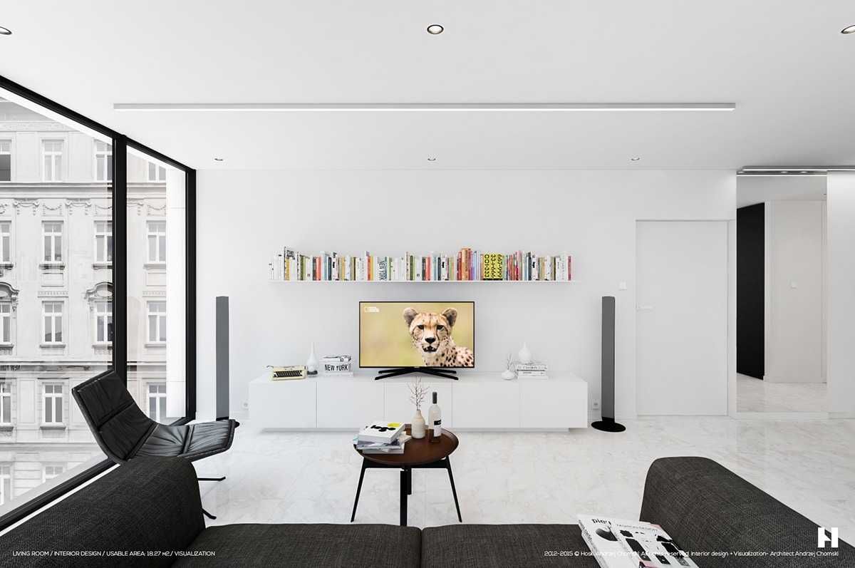 Черная стенка в большой белой гостиной