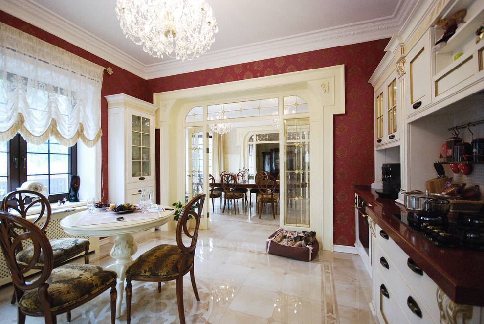 На фото стены в кухне оформлены бордово-золотыми обоями.