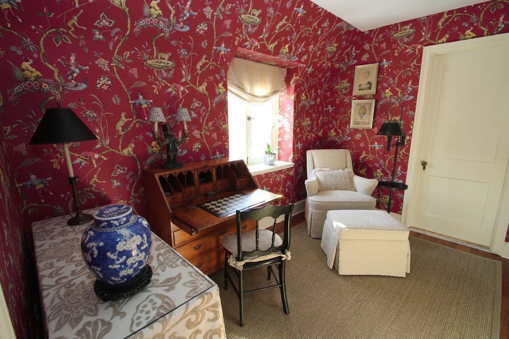 Бордовые обои помогут настроиться на рабочее настроение. В сочетании с натуральным деревом и кожаной мебелью получится полноценный кабинет в английском стиле.