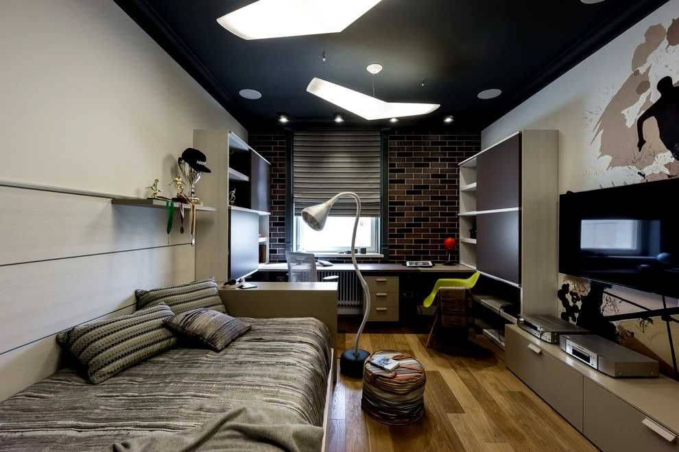 урбанистический стиль предполагает использование любых фактур. Установите многоуровневую конструкцию, оформленную фотопечатью с силуэтом города, чтобы поддержать интерьерный стиль, разграничить комнату на зоны. Актуален этот прием для компактных квартир-студий. Разбавьте контраст черного и белого бежевыми оттенками;
