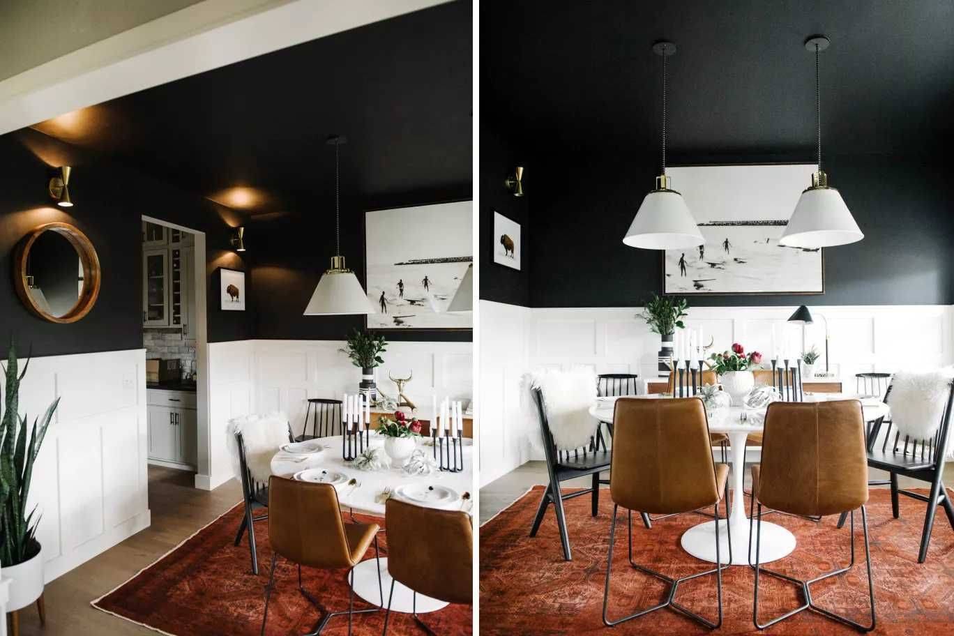 2.2 Чёрный потолок с чёрным бордюром. Если покрасить в чёрный цвет не только потолок, но и потолочный бордюр или верхнюю часть стены, то можно полностью изменить восприятие интерьера. Благодаря такому приёму цветовой переход между стеной и потолком станет невидим, а пространство над головой будет казаться бесконечным. Хотя, всё зависит от реальной высоты комнаты.