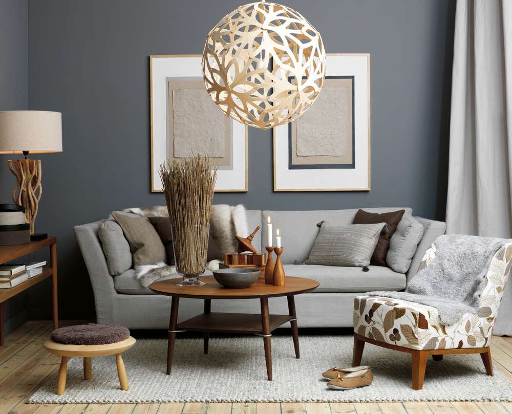 На фото теплый серый цвет в оформлении гостиной в скандинавском стиле.