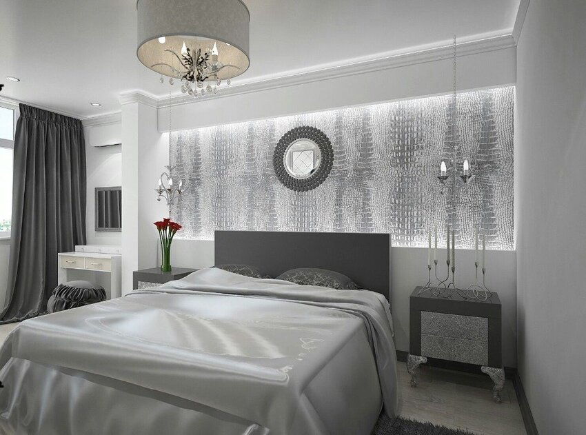 Белый с серым отлично сочетаются, формируя в спальне классический вариант интерьера.