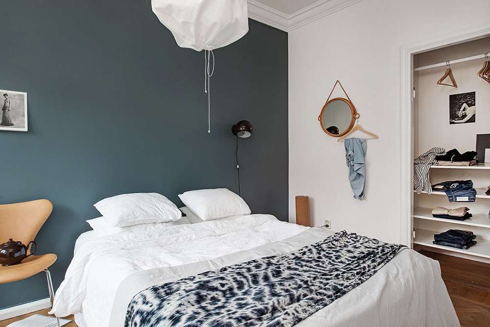 Для скандинавской спальни серый цвет обычно выступает базой при оформлении стен. Однако он крайне редко становится монохромом.