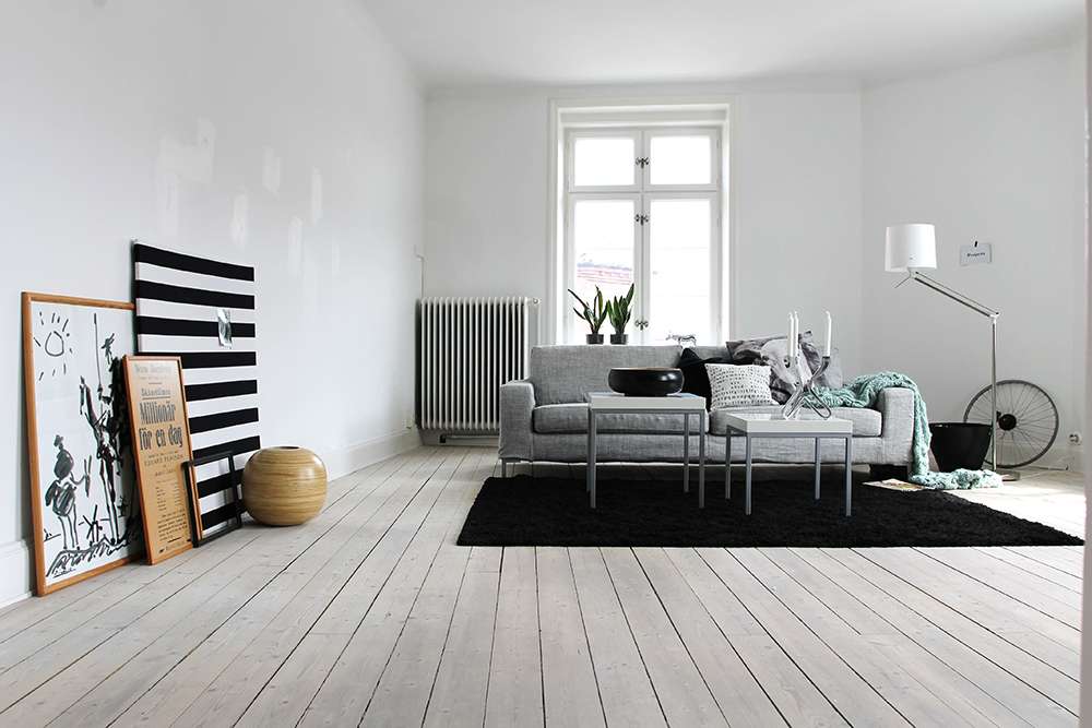 Хорошо смотрятся и полы из натурального дерева. Породы с сероватым оттенком (белый клён, серо-коричневый орех) стоят довольно дорого, но с интерьером в серых тонах хорошо сочетаются и более привычные цвета древесины. При желании можно подобрать и серый ламинат, имитирующий фактуру дерева.