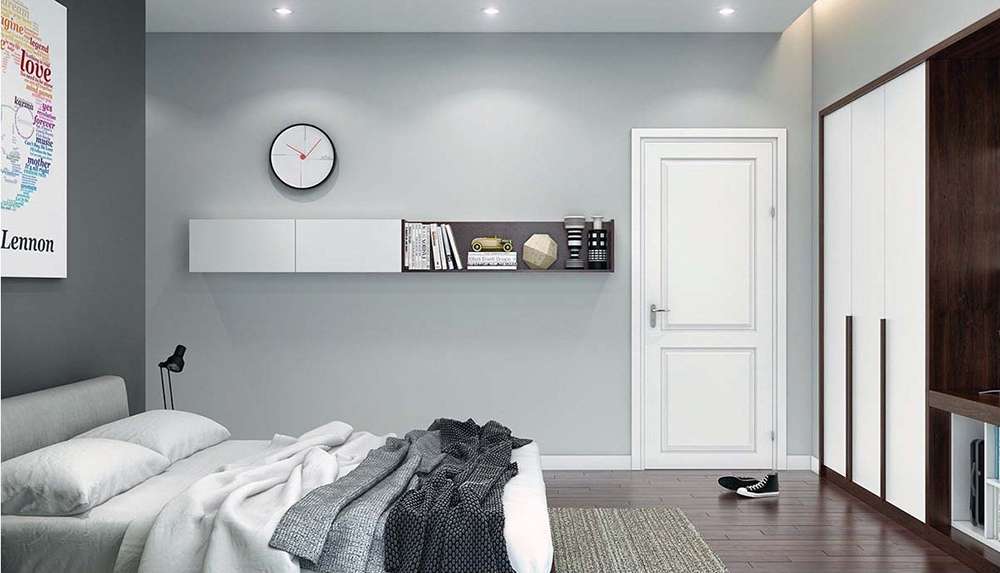 Такой вариант оформления будет уместен для интерьеров в темно-серых тонах. Серая спальня хорошо смотрится с белой мебелью: такие конструкции на фоне серых стен выглядят легче и компактнее.